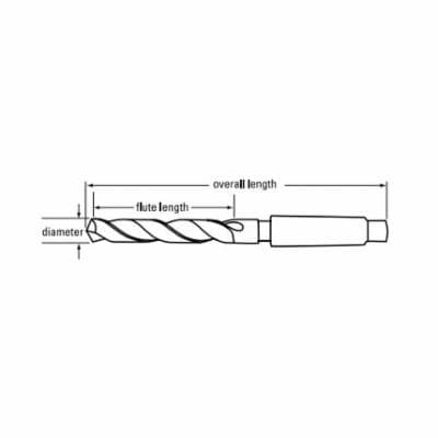 Foret à queue conique Chicago-Latrobe® surdimensionné série : 2412 Imperial Foret 3/4 po - Fraction 0 75 po - décimal pouce 10-1/2 po de longueur hors tout 5-7/8 po de profondeur de coupe 2 cannelures cannelure en spirale 5-7/8 dans la longueur de cannelure #3 Morse Shank Shank Designation 118 degrés pointe radiale sens de coupe à droite HSS Bord liquide caloporteur non traversant SSC oxyde de vapeur matériaux applicables : acier allié à outils acier au carbone et fonte