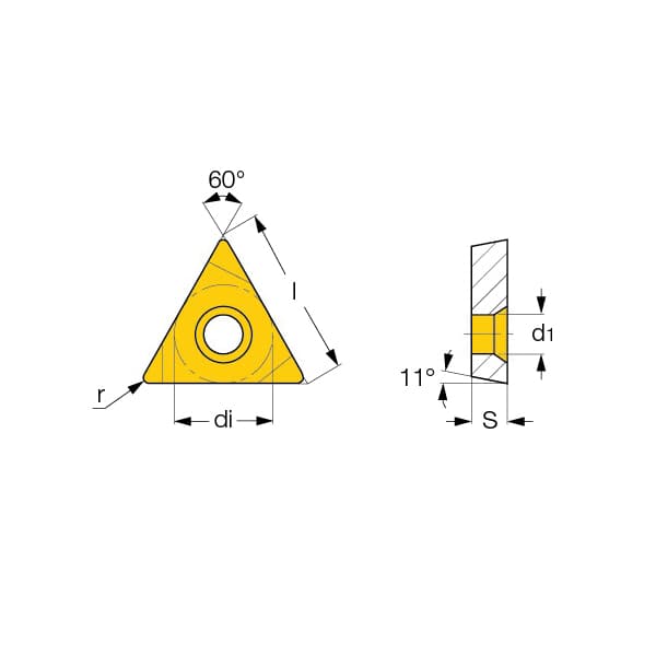 Insert de tournage Iscar insert TPGX 221 insert triangulaire profondeur de coupe maximale de 3 mm cercle inscrit de 6 35 mm épaisseur de 3 18 mm 11 sièges râteau positif disjoncteur L rayon d'angle de 0 4 mm diamètre de trou de 3 5 mm grade du fabricant : IC20N Code ANSI : TPGX 221-L IC20N ISO : TPGX 110304-L IC20N Angle de 60 degrés inclus angle de décharge de 11 degrés coupe à gauche carbure non revêtu Grade : M P devant servir sur : acier inoxydable et acier