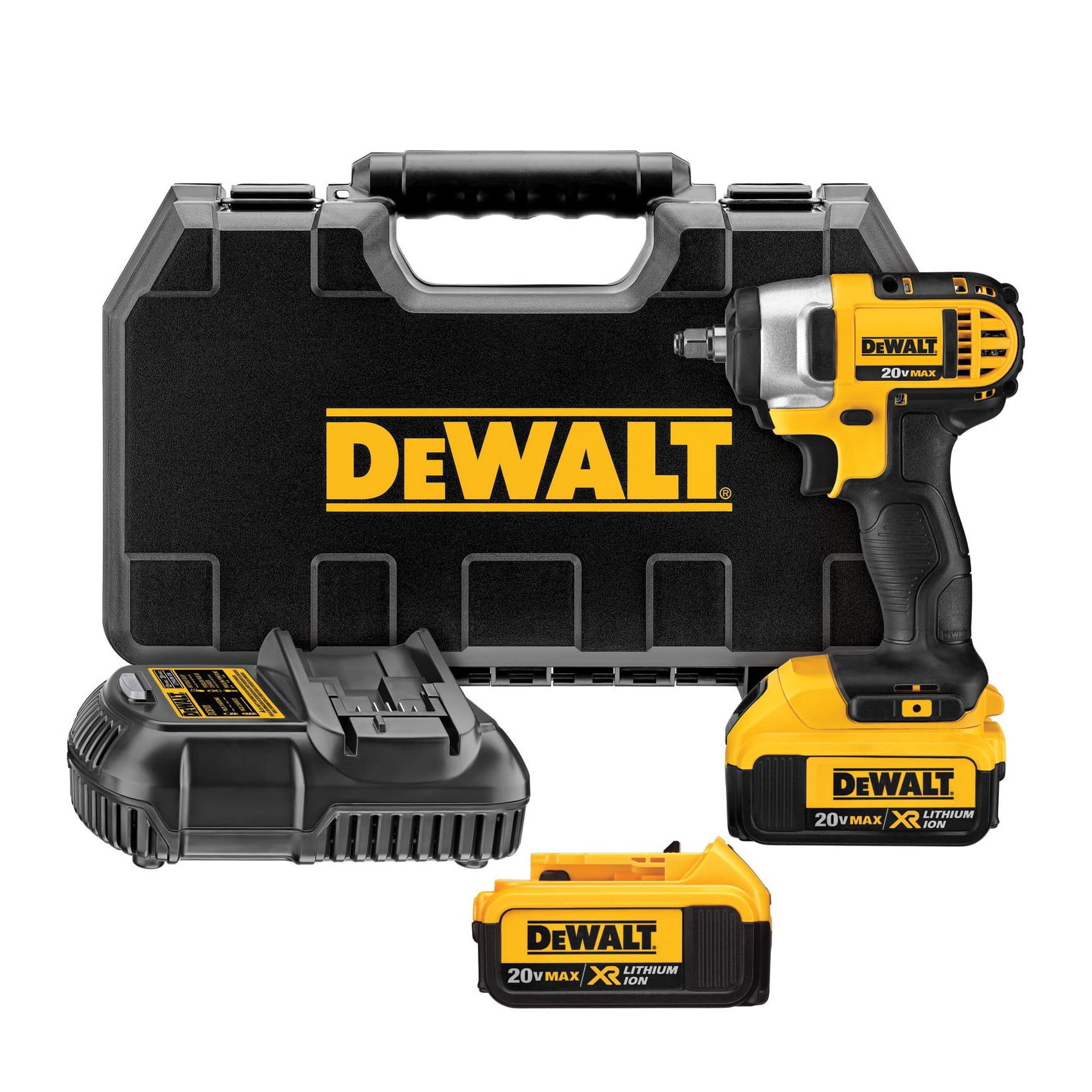 DeWalt® MAX MAX" Clé à chocs sans fil compact léger trousse nue/trousse série : XR® carré lecteur 3/8 po couple 1560 in-lb vitesse 0 à 2300 tr/min 20 VDC batterie au lithium-ion batterie de 4 Ah batterie incluse : Oui matériau de boîtier en plastique poignée antiglissement/confort texturée poignée de pistolet vitesse variable/avant/inverse Commande de l'interrupteur longueur hors tout de 5-3/4 po