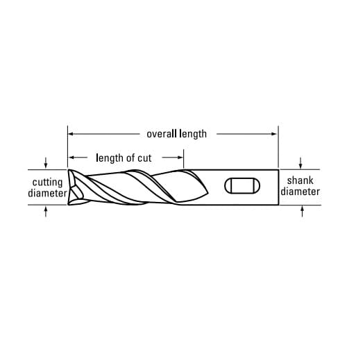 Cleveland® End Mill Center Cutting General Purpose Single End Square End Series: HG-2 11/16 in Diameter Cutter 3-3/4 in Overall Length 1-5/16 in Length of Cut 2 Flutes Spiral Flute 5/8 in Shank Diameter Right Hand Cutting Direction 30 deg Helix Angle Straight/Weldon Flat Shank HSS TiN Coated