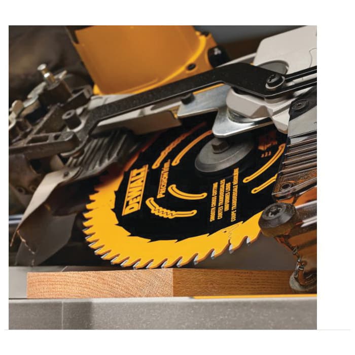 DeWALT® Precision Trim" Circular Saw Blade 10 in Diameter 0.071 in Thickness 5/8 in Arbor ATB Teeth 40 Teeth 20 deg Tooth Angle 6000 rpm Maximum 4 in Cutting Depth 0.098 in Kerf Carbide Cutting Edge Carbide Blade Tough Coated Applicable Materials: Wood