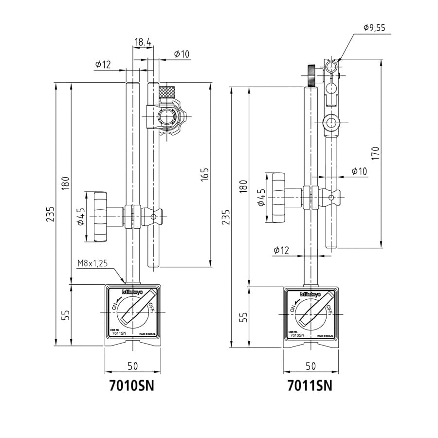 Mitutoyo Magnetic Stand 600 N Magnetic Pull 59 mm L x 50 mm W x 55 mm H Base 235 mm Overall Length 10 mm Rod Diameter 170 mm Rod Length 12 mm Upright Post Diameter 180 mm Upright Post Length M8 x 1.25 Thread