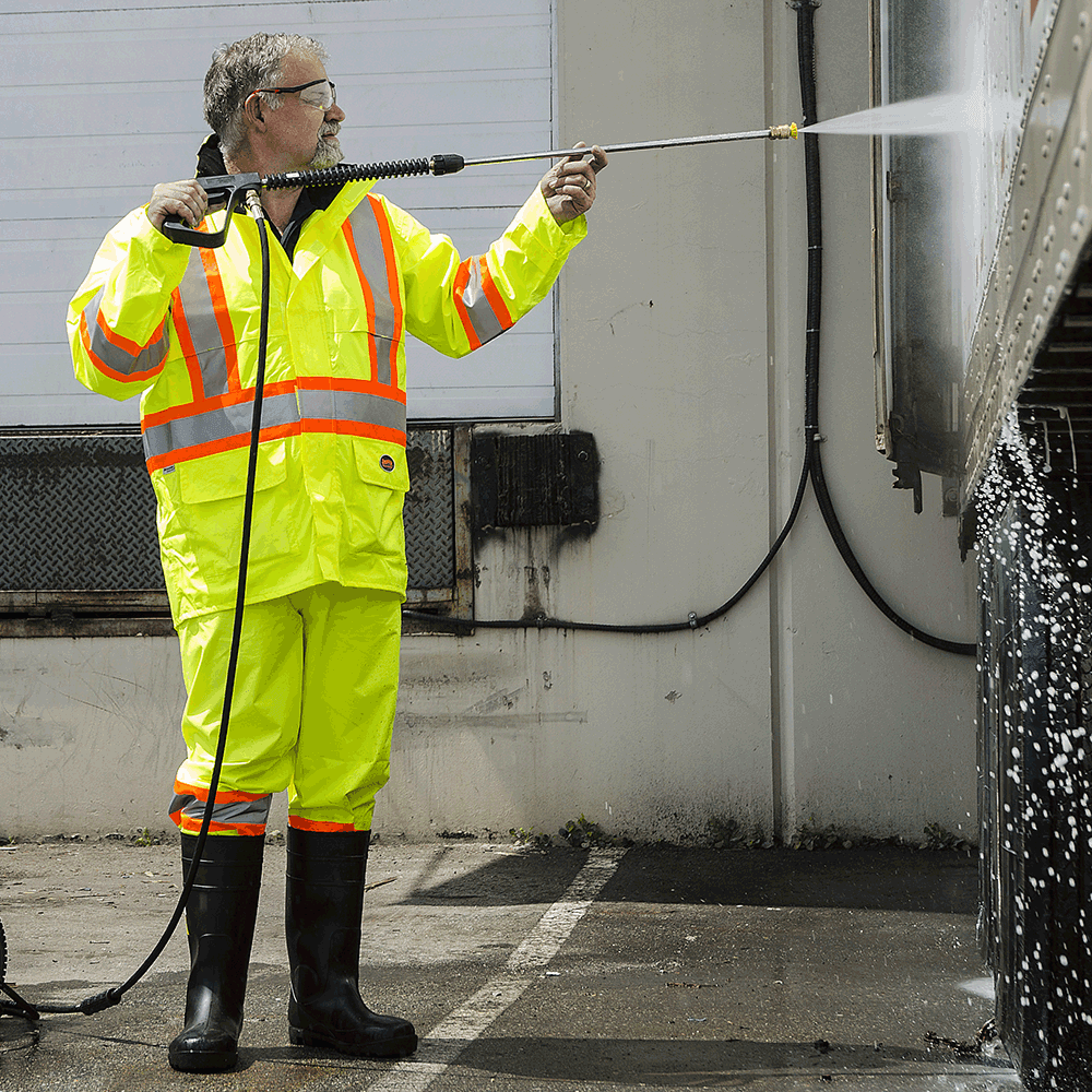 - STARTECH® reflective tape Taped and heat sealed seams Superior tear and abrasion-resistant fabric Liberal fit and full back vent for working comfort (2) lower flap pockets Half mesh lined vented back Hood folds into collar Full front zipper